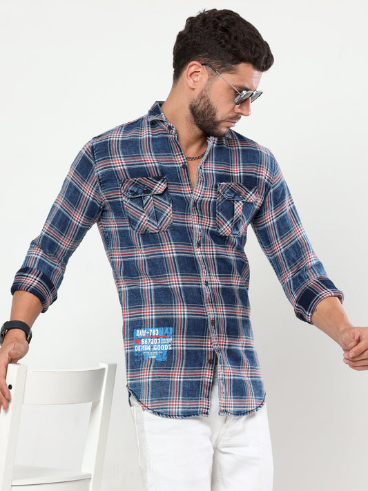 Onfire Denim Indigo Checks Cargo Shirt 2258 Blue/Red
